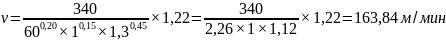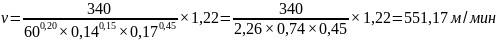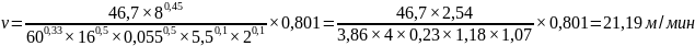 Скорость резания определяется по формуле 3.43, м/мин