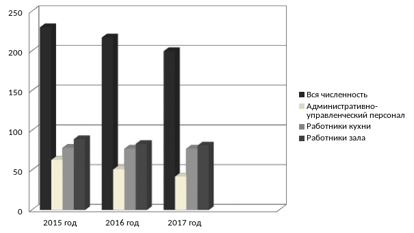 Также, после проведения анализа структуры персонала по различным критериям было выяснено, что наибольшее количество составляют сотрудники без опыта работы – примерно 60%. Это обусловлено тем, что основная масса работников студенты, которые еще находятся в процессе обучения или заканчивают свое обучение. Для таких сотрудников должны быть организованы соответствующие мероприятия для обучения в сфере обслуживания, а также курсы повышения квалификации для остального персонала.