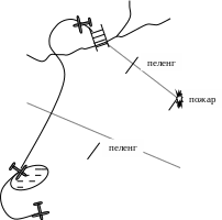 Второй метод основан на определении местонахождения пожара по двум пеленгам. Его суть заключается в том, что летчик-наблюдатель устанавливает истинные пеленги на пожар при полете от двух опознанных на местности ориентиров. Откладывая эти пеленги на патрульной карте, он определяет местонахождение пожара на их пересечении (рисунок 1.4).