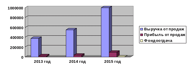 | Приложение Д. Основные экономические показатели деятельности ООО «Дальтехкомплект» за 2013 – 2015 гг. | Показатель | Год | Абсолютное отклонение | Темп роста,% | | 2013 | 2014 | 2015 | 2014/ 2013 гг. | 2015/ 2014 гг. | 2014/ 2013 гг. | 2015/ 2014 гг. | | Выручка от продаж, тыс. руб. | 373 846 | 550 559 | 999 475 | + 176 713 | + 448 916 | 147 | 182 | | Себестоимость продаж, тыс. руб. | 340 054 | 493 214 | 838 632 | + 153 160 | + 345 418 | 145 | 170 | | Затраты на 1 руб. реализованной продукции, коп. | 0,91 | 0,90 | 0,84 | - 0,01 | - 0,06 | 99 | 93 | | Прибыль от продаж, тыс. руб. | 19 849 | 38 270 | 93 113 | + 18 421 | + 54 843 | 193 | 243 | | Чистая прибыль, тыс. руб. | 15 392 | 35 405 | 82 334 | + 20 013 | + 46 929 | 222 | 233 | | Среднесписочная численности, чел. | 37 | 40 | 38 | + 3 | - 2 | 108 | 95 | | Среднемесячная заработная плата по предприятию, тыс. руб. | 28 400 | 32 000 | 34 500 | + 3 600 | + 2 500 | 113 | 108 | | Товарооборот на 1 работника тыс. руб./чел. | 10 104 | 13 764 | 26 302 | + 3 660 | + 12 538 | 136 | 191 | | Среднегодовая стоимость ОС, тыс. руб. | - | - | 1 867 | - | + 1 867 | - | - | | Фондоотдача, руб./руб. | - | - | 535 | - | + 535 | - | - | | Рентабельность продаж, рассчитанная по чистой прибыли, %. | 4 | 6 | 8 | + 2 | + 2 | 150 | 133 | |