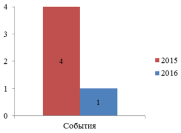 За 12 месяцев 2016 года допущено одно событие, связанное с нарушением правил безопасности движения и эксплуатации железнодорожного транспорта, против четырех событий за 12 месяцев 2015 года, события отражены на гистограмме на рисунке 3.2.