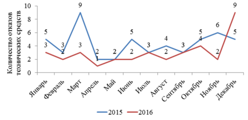 На рисунке 3.5 сравниваются отказы технических средств за 2015 и 2016 года.