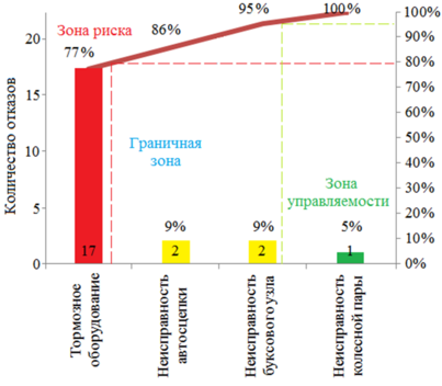 Рисунок 3.5–Диаграмма Паретто по причинам отказов технических средств за 12 месяцев 2016 года по неисправностям отнесенные по виновности за работниками депо с разбивкой по зонам риска.