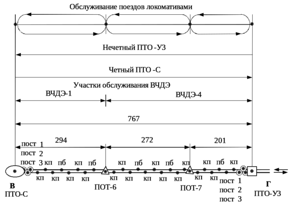 Рисунок 1.3–Размещение предприятий вагонного хозяйства, участки обслуживания, гарантийные участки и схема обслуживание поездов локомотивами между станциями В–Г.