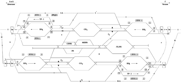 Рисунок 1.4–Схема размещения парков сортировочной станции В. Условные обозначения: ЛХ – локомотивное хозяйство; ВХ – вагонное хозяйство; ПП1 и ПП2 – парки прибытия; СП1 и СП2 – сортировочные парки; ПО1 и ПО2 – парки отправления; ТР-1 и ТР-2 – транзитные парки; МПРВ – механизированные пути для ремонта вагонов; ЭК – экипировочные устройства локомотивного хозяйства; СПРВ – специализированные пути для ремонта вагонов; ВЧДЭ – помещение эксплуатационного вагонного депо; ПТО – помещение пункта технического обслуживания; Г1 и Г2 – горка нечетного и четного направлений; 1п – пост 1; 2п – пост 2; 3п – пост 3; 1 – помещение для обогрева вагонников; 2 – островок безопасности.
