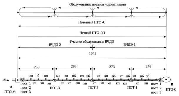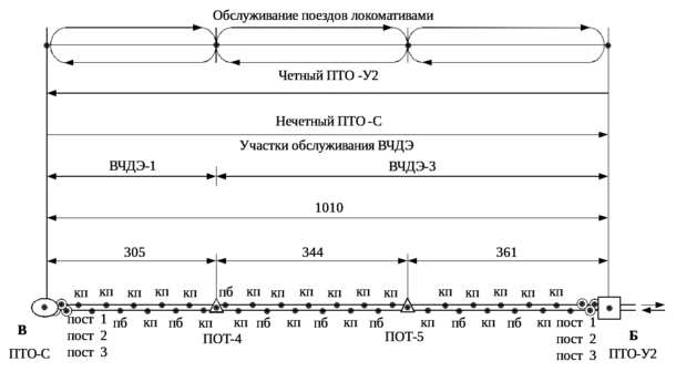 В соответствии с длиной участков безостановочного движения имеется возможность разместить ПОТ и ПТО, а также контрольные посты (КП) и посты безопасности (ПБ) на каждом направлении. Размещение ПОТ и ПТО, КП и ПБ на направлениях А–В, Б–В и В–Г показаны на рисунках 1.1–1.3.