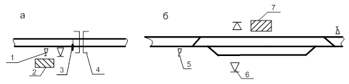Рисунок 1.8–Схема размещение средств технологической оснастки на ПБ. Условные обозначения: а – на железнодорожном переезде; б – на промежуточной станции; 1 – знак «пост безопасности» перед переездом; 2 – помещение дежурного по переезду; 3 – устройство обнаружения нижней негабаритности; 4 – переезд; 5 – знак «пост безопасности» перед станцией; 6 – прожекторные установки; 7 – помещение ДСП.