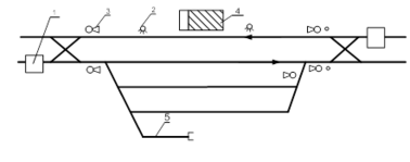Рисунок 1.7–Схема размещения средств технического оснащения КП: 1 – перегонное средство технического диагностирования, 2 – прожекторы, 3 – колонки двухсторонней парковой связи, 4 – помещение ДСП с помещением обогрева ремонтно-смотровой бригады, 5 – тупик для вагонов, требующих текущего отцепочного ремонта.