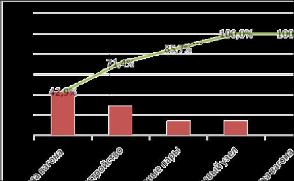Диаграмма Парето является графическим отображением правила Парето. В менеджменте качества применение этого правила показывает, что значительное число несоответствий и дефектов возникает из-за ограниченного числа причин. Коротко правило Парето формулируется как 80 на 20. Например, если применить это правило по отношению к дефектам, то окажется, что 80 процентов дефектов возникает из-за 20 процентов причин.