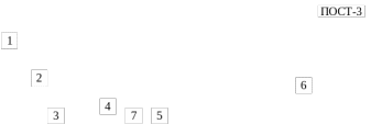 Рисунок 1.6 – Техническое оснащение парка отправления: 1 – устройство централизованного ограждения составов; 2 – колонки переговорные; 3 – помещения для бригад; 4 – настил пешеходный; 5 – УЗОТ-РМ; 6 – мачта освещения; 7 – колонки автоматизированной системы опробования тормозов.