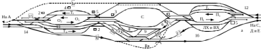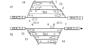 Рисунок 1.7 – Техническое оснащение транзитных парков: а) – транзитный парк нечетного направления; б) – транзитный парк четного направления .1 – устройство централизованного ограждения; 2 –ПТО; 3 – помещение оператора ПТО; 4 – помещение для отдыха и обогрева смотровых бригад; 5 – сигнал ограждения состава; 6 – установка ремонтная на базе машины «Камаз»; 7 – переезд; 8 – колонка оповестительно-переговорной связи; 9 – помещение для отдыха бригады; 10 – пути транзитного парка четного направления; 11 – пути транзитного парка нечетного направления; 12 – светофоры; 13- стационарные стеллажи; 14 – переезды.