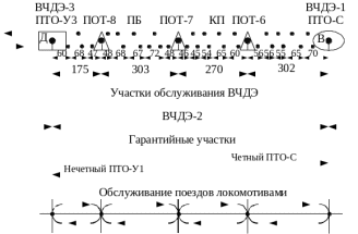 Схемы гарантийных участков с расположением предприятий вагонного хозяйства, участков обслуживания ВЧД и обслуживания поездов локомотивами приведены на рисунках 1.1, 1.2, 1.3 и 1.4.