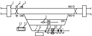 На рисунке 1.9 показано: 1 – перегонное средство технического диагностирования; 2 – прожекторы; 3 – колонки двухсторонней парковой связи; 4 – станционные домкраты; 5 – ремонтная установка; 6 – помещение обогрева ремонтно-смотровой бригады; 7 – тупик текущего ремонта; 8 – стеллаж для запасных частей и материалов; 9 –тупик для хранения колесных пар; 10 – кран балка; 11 – площадка для стоянки ручной дрезины; 12 – дрезина с ручным приводом.