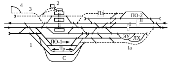 На рисунке 1.8 следующие обозначения: ПО-1, ПО-2 – нечетный и четный приемно-сортировочный парки; ГР – грузовой район; С – парк сортировочный; ЛХ – локомотивное хозяйство; ЭУ – экипировочные устройства; I, II – главный путь нечетного и четный направления; Ia – обходной путь; IIa – дополнительный путь отправления; 1 – горка малой мощности; 2 – багажные отделения; 3 – путь стоянки пассажирских составов; 4 – мастерские.