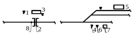 Рисунок 1.10 – Схема размещения средств технологической оснастки на посту безопасности (ПБ): 1 – знак «пост безопасности» перед переездом; 2 – переезд; 3 – помещение дежурного по переезду; 4 – знак «пост безопасности» перед станцией; 5 – помещение ДСП; 6 – прожекторные установки; 7 – помещение ПТО; 8 –устройство обнаружения нижней негабаритности.