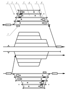 1 – помещение для отдыха бригады; 2 – мачта освещения; 3 – переезд; 4 – стационарные стеллажи; 5 - асфальтированные междупутья; 6 – колонка оповестительно-переговорной связи; 7 - ремонтная установка; 8 – устройства централизованного ограждения