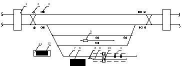 Рисунок 1.9 - Размещение средств технического оснащения КП: 1-перегонное средство технического диагностирования;2-прожекторы; 3-колонки двухсторонней парковой связи;4-станционные домкраты;5- ремонтная установка;6-помещение обогрева ремонтно-смотровой бригады;7- тупик текущего ремонта;8- стеллаж для запасных частей и материалов;9-тупик для хранения колесных пар;10- кран балка;11-площадка для стоянки ручной дрезины; 12-дрезина с ручным приводом.