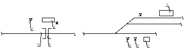 1-знак «пост безопасности» перед переездом; 2-переезд; 3-помещение дежурного по переезду; 4-знак «пост безопасности» перед станцией; 5-помещение ДСП;6-прожекторные установки; 7-помещение ПТО; 8-устройство обнаружения нижней негабаритности.