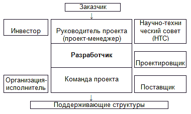 Руководитель проекта- юридическое лицо, которому заказчик делегирует полномочия по руководству работ по проекту, т. е. по планированию, контролю и координации участников проекта. Конкретный состав полномочий руководителя проекта определяете и контрактом с заказчиком. Команда проекта - специфическая организационная структура, возглавляемая руководителем проекта и создаваемая на период осуществления, с целью эффективного достижения его целей. Состав и функции команды проекта зависят от масштабов, сложности и других характеристик. Разработчиком проекта является команда проекта вместе с его руководителем. Для выполнения части своих функций разработчик может привлекать специализированные организации [45, с.416].