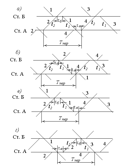 На рисунках 4.1и 4.2 представлены четыре способа пропуска поездов через ограничивающий перегон. Выбирается для расчёта тот, при котором период графика имеет наименьшее значение.