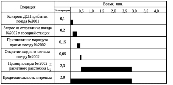 Продолжительность интервала неодновременного прибытия включает в себя время на выполнение технологических операций по контролю прибытия одного поезда и время прохода встречным поездом расчетного расстояния.