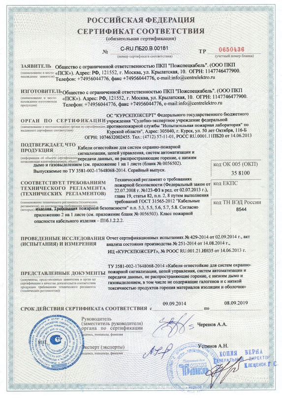 Рисунок А.3 Сертификат соответствия кабеля для систем ОПС и