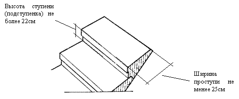 Ширина проступи на лестнице должна быть как правило, не менее 25 см, а высота ступени — не более 22 см. (рисунок. 3.2)