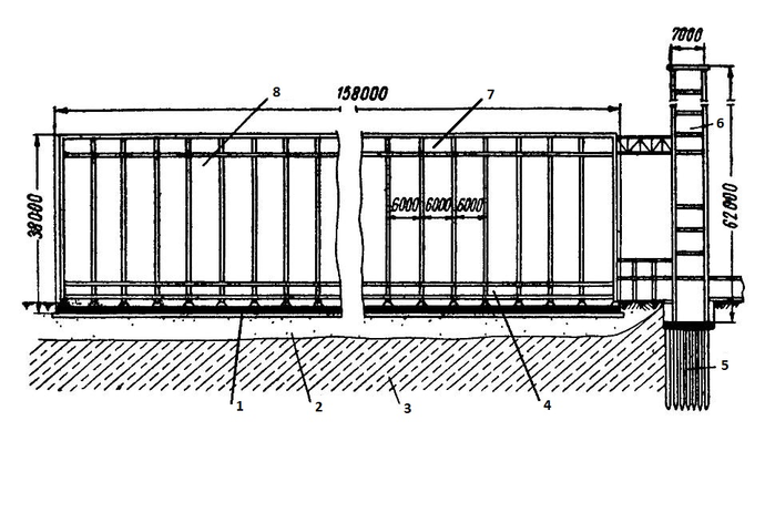 5 – сваи; 6 – башня элеватора; 7 - надсилосный этаж; 8 - элеваторы