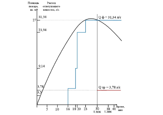 Рисунок М.1 Совмещенный график изменения площади пожара, требуемого и фактического расхода огнетушащих веществ