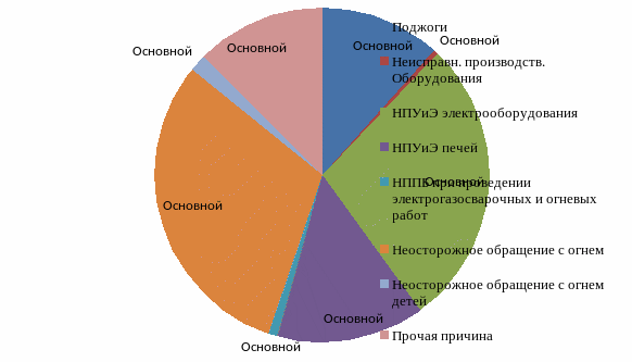 На диаграмме четко видно, что преобладающую позицию занимает неосторожное обращение с огнем, 30,6 % от общего числа. На втором месте находится НПУиЭ электрооборудования, 27,9 %. НПУиЭ печей, 14,4 %. И на четвертом месте находятся поджоги, это 11,7 % от общего числа. Исходя из приведенной статистики это основные четыре причины пожаров.