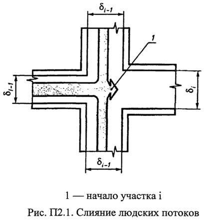 При слиянии в начале i-го участка двух и более людских потоков (рисунок 5.1) интенсивность движения qi, м/мин, рассчитывают по формуле 5.7: