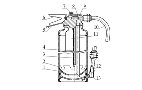 Рисунок 2.6 Огнетушитель ОП-10, применяемый в ОП «Энергосбыт»: 1 – корпус – сосуд с порошком, 2 –мембрана эластичная, 3 – вспушиватель, 4 – сифон, 5 – рукоятка, 6 – рычаг, 7 – пробойник, 8 – клапан, 9 – головка, 10 – шланг, 11 – баллон со сжатым воздухом, 12 – насадок, 13 – фиксатор насадка