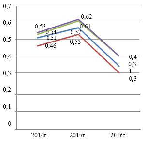 Значение коэффициента общей ликвидности (Кол) в 2014 году составило 0,51, в 2015 году оно немного возросло до 0,57, тем не менее в 2016 году замечается тенденция к снижению – к концу анализируемого периода данный показатель составил 0,34. Показатели Кол не соответствуют нормативу (≥1).