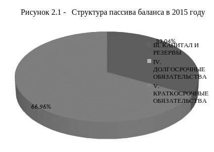 Оценивая структуру пассивов, необходимо сделать вывод о том, что преобладающую долю источников финансирования занимают краткосрочные обязательства. В 2013 г. их доля составляла 74,63 %. В 2014 г. наблюдается снижение значения до 73,70 % и в 2015 г. – 66,96 %. Складывающуюся тенденцию следует рассматривать положительно, поскольку при этом уменьшается зависимость от внешних источников финансирования, улучшается финансовая устойчивость. Доля собственного капитала, таким образом, возрастает с 26,30% до 33,04 %.