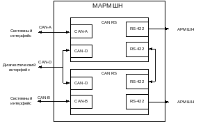 Модуль МАРМ ШН обеспечивает подключение АРМ ШН к системному и информационно-диагностическим CAN-интерфейсам системы АБТЦ-И.