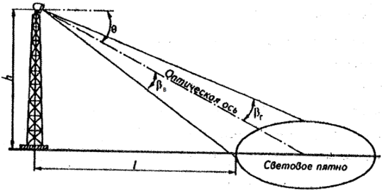 Следует помнить, что при установке прожектора на мачте с углом наклона у её подножия остается неосвещенная зона, длина которой увеличивается с уменьшением угла. Длина неосвещенной зоны рассчитывается по формуле