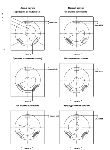 Угол поворота ротора-сектора изменяется поводком, положение которого может быть проверено по шкале на крышке датчика. При втянутом положении шибера ротор-сектор левого датчика обеспечивает контроль переведенного положения (повернут на угол 120º±5º), а ротор-сектор правого датчика – контроль начального положения (занимает исходное положение, угол 0º±5º). При взрезе стрелочного перевода ротор-сектор повернут на угол 60º±10º и выполняет контроль среднего положения.