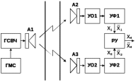 При свободности участка вырабатываемый генератором сверхвысоких частот СВЧ- сигнал излучается передающей антенной А1 по КПС воспринимается антеннами А2 и А3 приемных модулей. РУ, обрабатывает полученные сигналы и формирует сигнал Х4. Этим регистрируется отсутствие транспортного средства. Полное или частичное экранирование подвижным составом приводит к отсутствию сигнала на приемных антеннах, что в свою очередь говорит о занятости участка.
