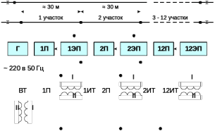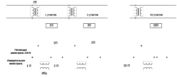 С помощью понижающих измерительных трансформаторов 1ИТ-12ИТ происходит преобразование длины свободного участка пути в электрический сигнал. Вторичные обмотки трансформаторов включены последовательно с контактами путевых реле 1П-12П. Они создают в первичной обмотке выходного трансформатора ВТ суммарное напряжение.