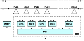 Следующим примером использования рельсовой линии для передачи питающего напряжения является построение бесстыкового КЗП с применением ИД типа ДИПЗ-800. Все эти датчики (ИД1-ИД15) устанавливаются на одном из рельсов через каждые 30 м в переделах зоны контроля вдоль сортировочного. В начале этой зоны к рельсовой линии подсоединяется источник питания ИПР переменного тока (f=800 Гц), а шунтирующая перемычка в конце этого участка. ИД преобразуют сигнальный ток в напряжения, которые в свою очередь поступают в преобразователь сигналов ПС на сравнивающие устройства СУ1-СУ15. Эти напряжения усиливаются, выпрямляются, а так же сравниваются между собой.