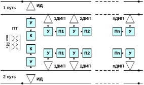 При другом способе построения бесстыкового КЗП применяются индуктивные датчики ИД (ДИП-72). В конце зоны контроля рельсы двух соседних путей соединяют перемычкой (шунт) , при этом в начале к крайним рельсам подключают питающий трансформатор ПТ. Датчики ИД устанавливают на противоположных рельсовых нитях этих путей. Расстояние выбирается с учетом длины контрольного участка. При наличии тока в рельсе каждый датчик 1ДИП-nДИП через усилитель У включает соответствующее им контрольное реле П1-Пn.
