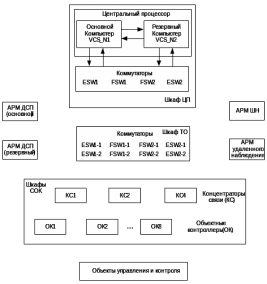 Полукомплект VCS_N1 функционирует в рабочем режиме, а VCS_N2 - в резервном. Резервный процессор не влияет на функционирование рабочего, но к нему непрерывно поступает информация со стороны системного программного обеспечения о состоянии рабочего процессора. В случае сбоя рабочего процессора резервный берет на себя всю обработку информации с сохранением имеющихся данных. Каждый полукомплект имеет встроенные типовые промышленные коммутационные модули сети Ethernet