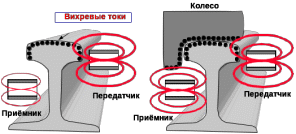 Блок напольной электроники генерирует сигнал, который выдаётся на передающую головку. Электромагнитное поле, вырабатываемое обмотками, создаёт вихревые токи на поверхности рельса. Вихревые токи в свою очередь создают очередное электромагнитное поле. Обмотки приёмной головки размещены в зоне воздействия электромагнитного поля и вырабатывают переменный сигнал частотой, равной частоте работы приёмника. Принцип работы головки представлен на рисунке 2.13.