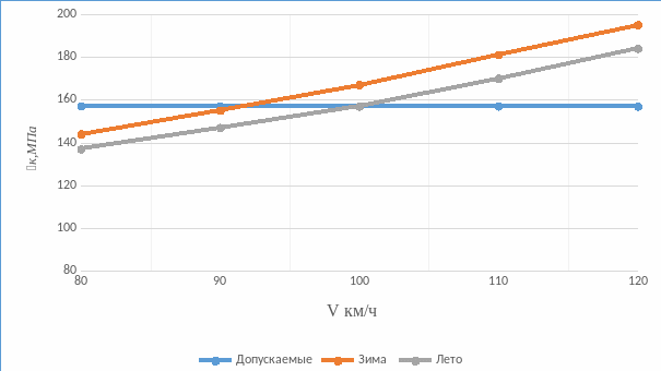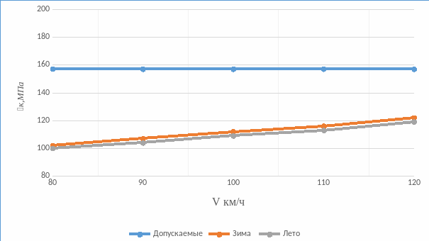 Оценочные расчетные критерии прочности пути меньше допускаемых для электровоза к <200 МПа, ш <1,6 МПа, б <0,42 МПа. Таким образом, на данном участке по условиям прочности максимальная скорость может быть установлена 100 км/ч.