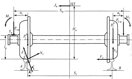 нагрузка от колес на рельсы; М1 и М2, – моменты, действующие на шейки оси; а1 и а2 – расчетные консоли шеек оси; Yр – рамная сила; lр – расстояние от головки рельса до приложения рамной силы; Jн – центробежная сила; Нц – расстояние от головки рельса до места приложения центробежной силы; F1 и F2 – силы трения гребня и поверхности катания колес по рельсам; N1 и N2 – реакции рельсов; S1 – расстояние между точками контакта колес с рельсами; Sш – расстояние между точками приложения сил к шейкам оси.[3]