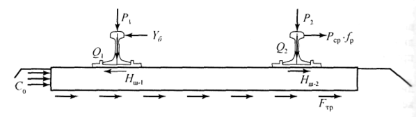 Рисунок 2.6 Расчетная схема определения поперечной устойчивости пути: Р1 и Р2 – нагрузка от колес на рельсы; Yб – боковая сила; Q1 и Q2 – давление рельсов к шпалу; Нш-1 и Нш-2 – поперечные силы, действующие на шпалу от двух рельсов; С0 – сопротивление смещению шпалы; Fтр – сила трения шпалы по балласту; fр – коэффициент трения скольжения колеса по рельсу[3].