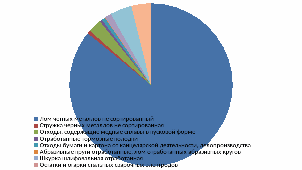 Затем идут отходы, относящиеся к пятому классу опасности (рисунок 2.3). Самый многочисленный отход в данном классе опасности оказался лом черных металлов несортированный, его масса составила 121,683 тонны. Данный вид отходов образуется от таких производственных подразделений, как гаражи и сварочный цех. Затем идут пищевые отходы кухонь и организации общественного питания несортированные, их масса составляет 5,229 тонн, данный вид отхода образуется, так как на территории работает столовая. 4,743 тонны составляют древесные отходы из натуральной чистой древесины несортированные, затем по массе идут отходы, содержащие медные сплавы в кусковой форме – 3,224 тонны. Отходы, в виде обрезков и обрывков тканей смешанных составляют 1,493 тонны. Массы остальных отходов не превышают тонны, что видно на представленной диаграмме. Несмотря на то, что данный класс опасности, практически, не несет вреда на окружающую среду, его количество очень велико.