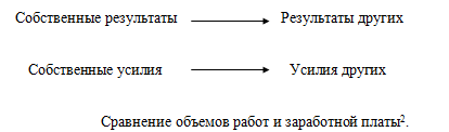 Когда два сотрудника выполнили одинаковый объем работы, но один из них получил большую заработную плату или другие поощрения, второй сочтет, что нарушен принцип справедливости, будет недоволен и заметно снизит свою мотивацию. Сравнение объемов работ и заработной платы происходит по такой схеме: