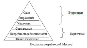 В теории Маслоу выделяют пять основных типов потребностей, составляющих иерархическую структуру, представленную на рисунке 5. По А. Маслоу, все потребности можно представить в виде определенной иерархической структуры, состоящей из относительно самостоятельных уровней, расположенных в особой последовательности. Эта последовательность направлена от группы первичных потребностей (физиологических, потребностей в безопасности) к группе вторичных, включающих набор социальных и производственных от них.