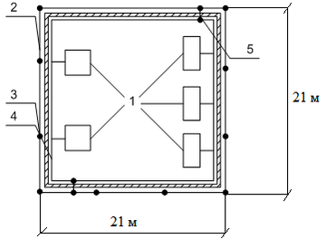 Рис. 6.1. Схема заземления цеха: 1 – электроустановка; 2 – соединительная полоса; 3 – вертикальный заземлитель; 4 – видимый контур заземления; 5 – соединитель видимого контура